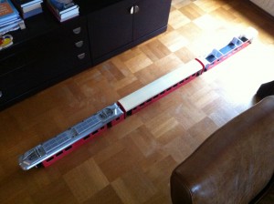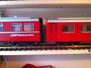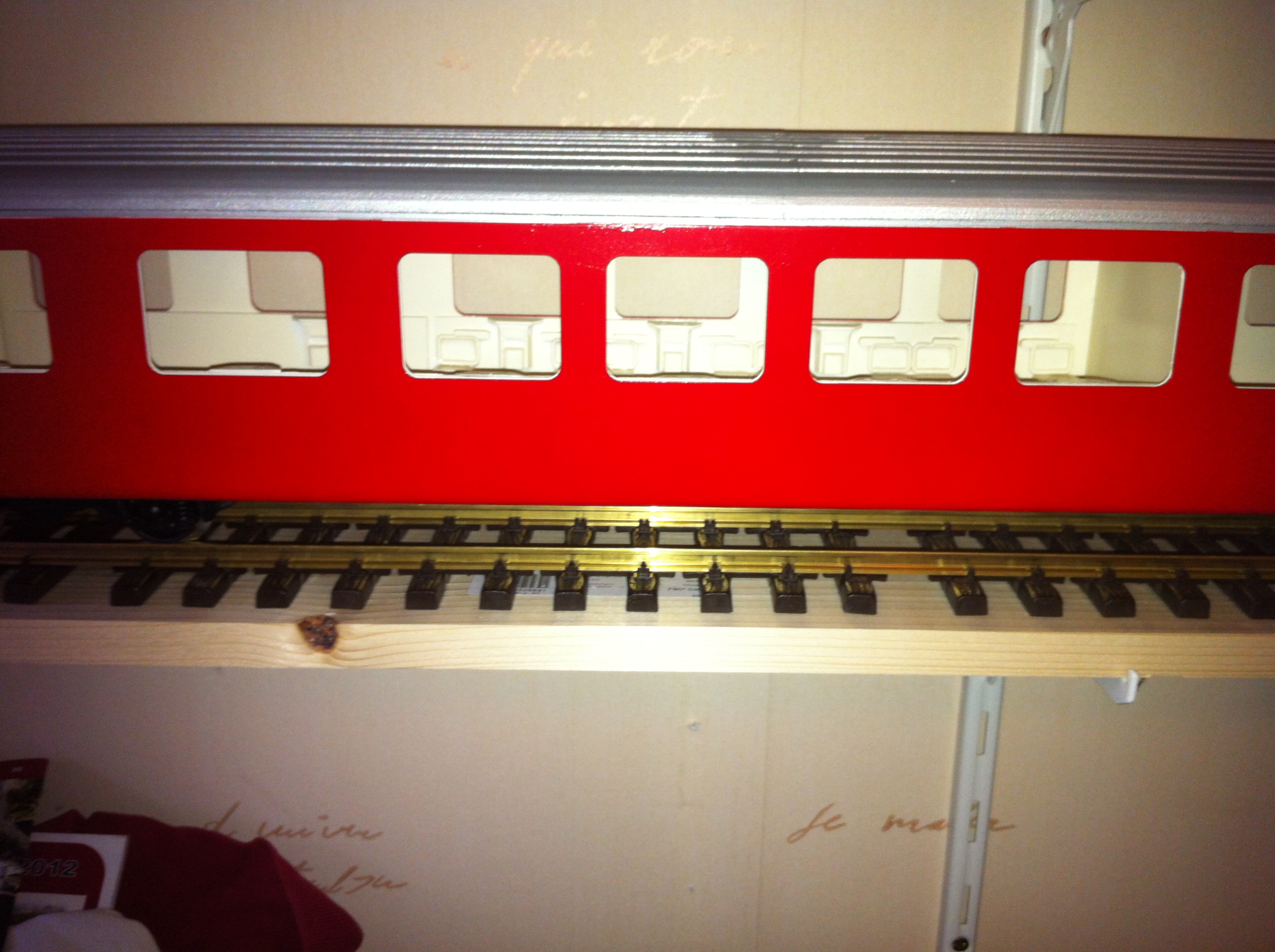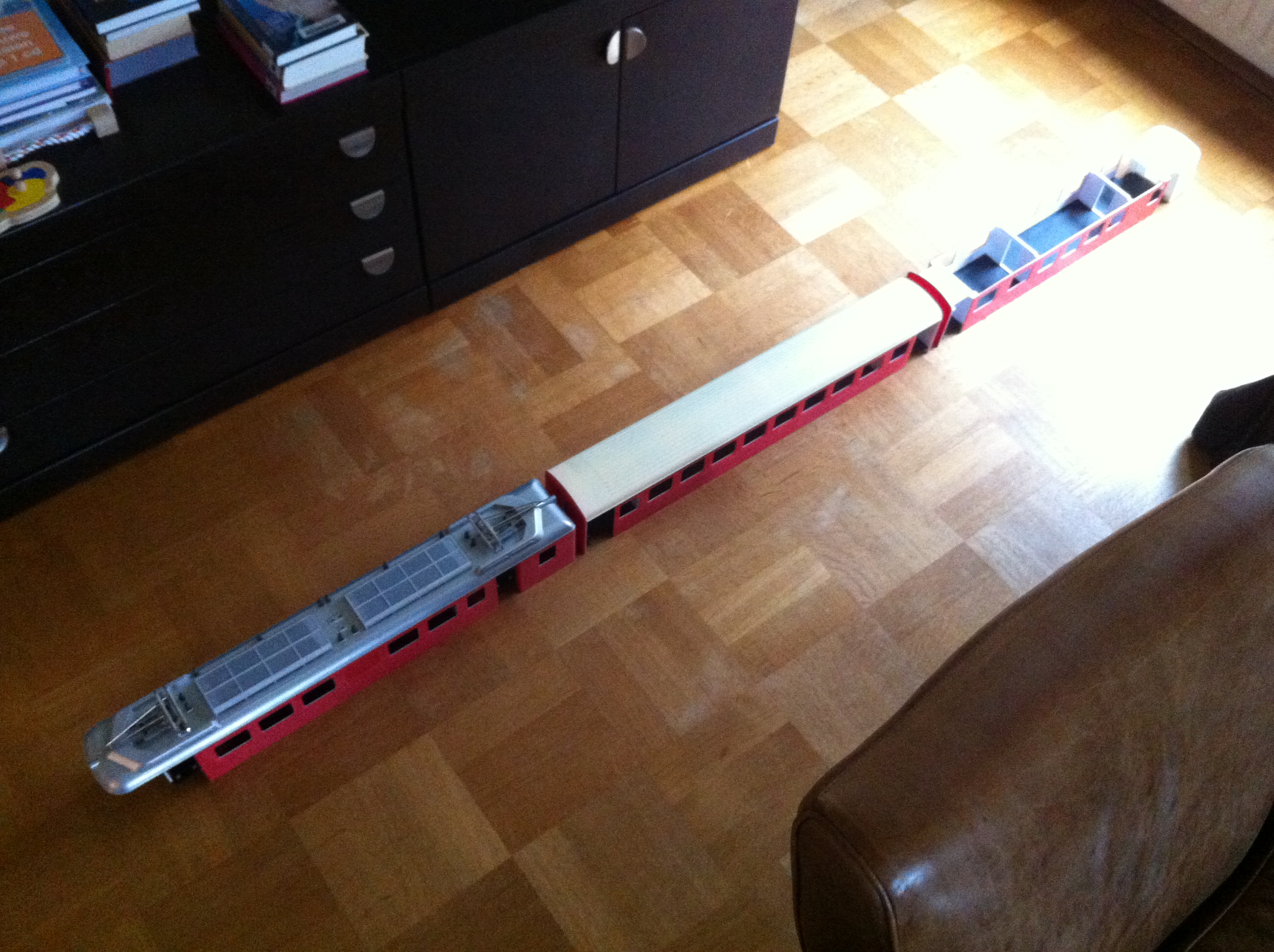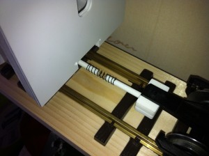 Ook heb ik nog een hele kleine aanpassing gemaakt aan de trekstang voor de draaistellen. Deze is nu flexibel en in lengte verstelbaar. Op deze manier kan je bijna met de wagonovergangen tegen elkaar aan rijden…: