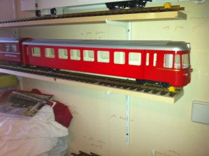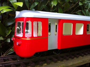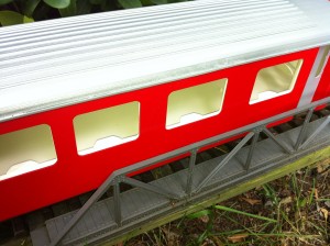 Gisteren was het prima weer om een beetje spuitwerk te doen. Het stuurstandrijtuig is het eerste rijtuig dat de rode kleur heeft gekregen. Eerst heb ik de hele bak (waar ondertussen de afvalemmertjes en stoelsteunen ingelijmd zijn) gespoten met Revell Basic Color. Dit spul zorgt voor een geweldige hechting op het oppervlak van het polystyreen en dat is in het verleden wel eens een probleem geweest. De kunststofhechters die ik tot voor kort gebruikte gaven nooit het beste resultaat. Vooral het afplakken van de modellen was niet te doen, iedere keer stok je de verf weer van het stuk af. Deze spuitbusjes van Revell doen wel wat ze moeten doen: een superondergrond geven.